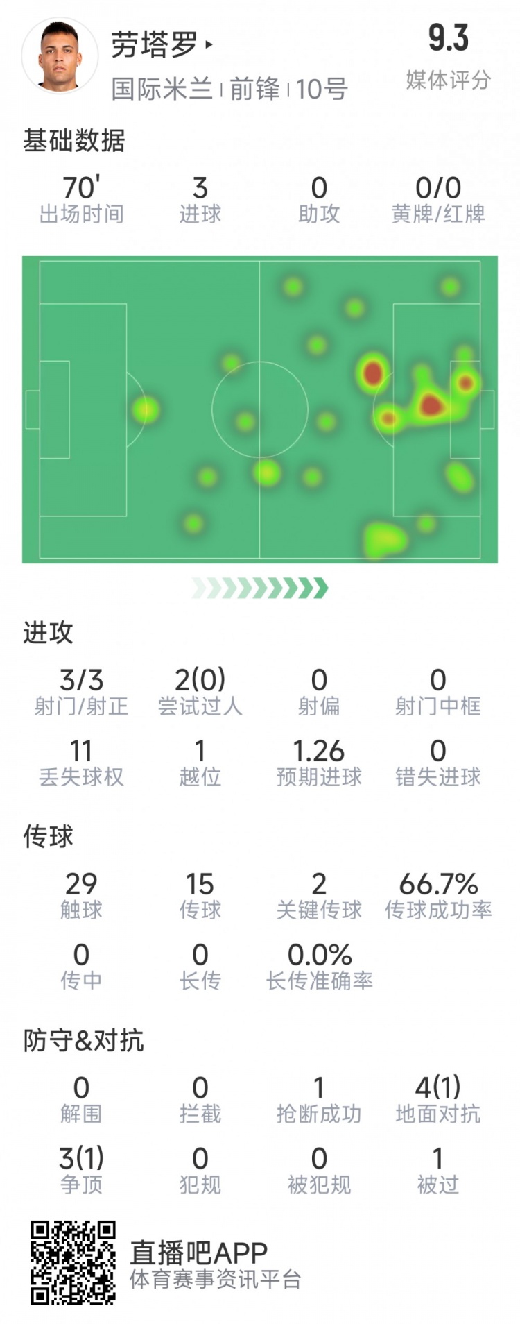 1月30日訊 在本輪歐冠國米對陣摩納哥的比賽中,勞塔羅上演帽子戲法,以下為他在本場數據:比賽時間70分鐘3粒進球3次射門均射正29次觸球2次關鍵傳球傳球成功率66.7%1次搶斷7次對抗2次成功sofa評分9.3分 本文標簽: 足球 意甲 國際米蘭