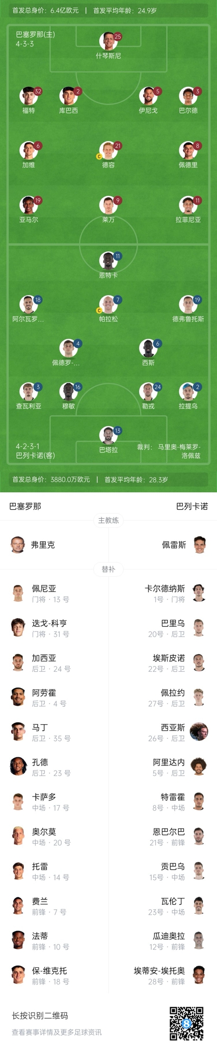 巴薩首發:25-什琴斯尼、2-庫巴西、5-伊尼戈-馬丁內斯、3-巴爾德、32-埃克托-福特、6-加維、21-德容、8-佩德里、11-拉菲尼亞、19-亞馬爾、9-萊萬多夫斯基