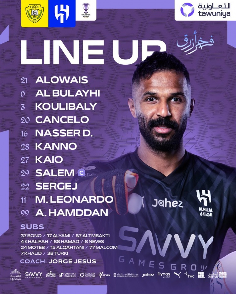利雅得新月首發:21-阿洛瓦伊斯、5-布萊希、3-庫利巴利、20-坎塞洛、16-N-多薩里、28-卡努、27-利馬、29-S-多薩里、22-米林科維奇、11-萊昂納多、99-哈姆丹