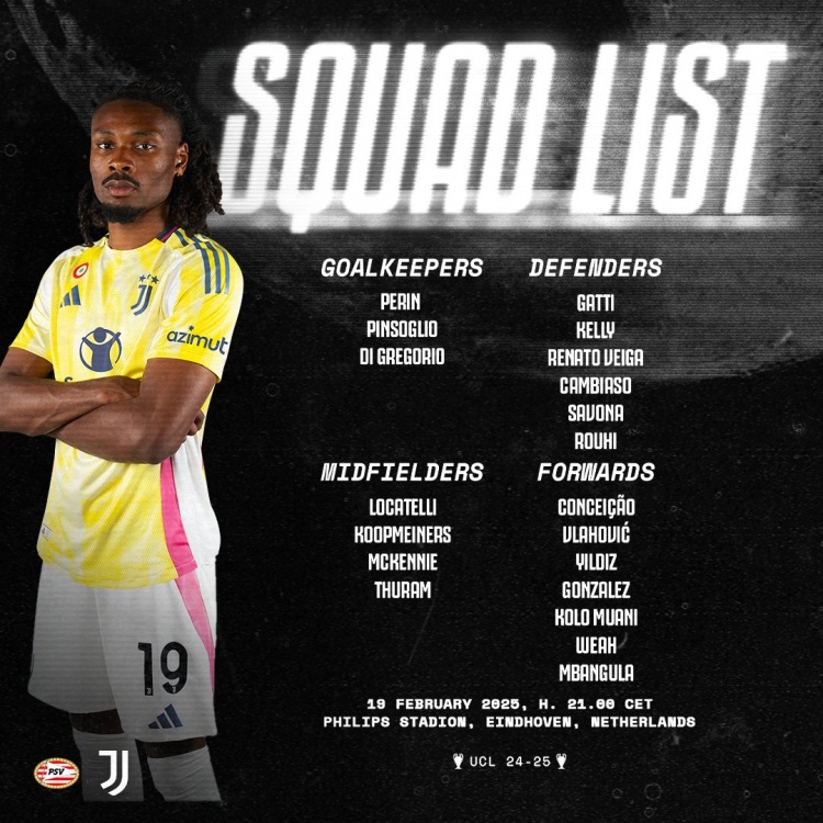 2月18日訊 北京時間本周四凌晨4:00的歐冠淘汰賽附加賽次回合,尤文將在客場對陣埃因霍溫。賽前,尤文公布了將出戰(zhàn)本場比賽的大名單。其中,小孔塞桑、穆阿尼等人在列,道格拉斯-路易斯、布雷默、卡盧盧等人繼續(xù)缺席。