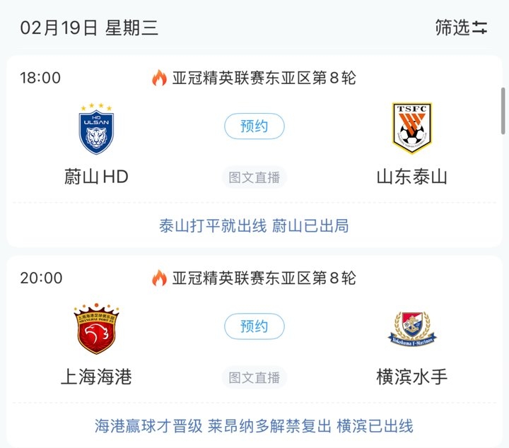 泰山和海港都將在明天出戰(zhàn),泰山只要不輸球就能拿到晉級名額,而海港需要3分才能升入晉級區(qū)。只要泰山輸球或海港不勝,申花就能晉級到淘汰賽階段。