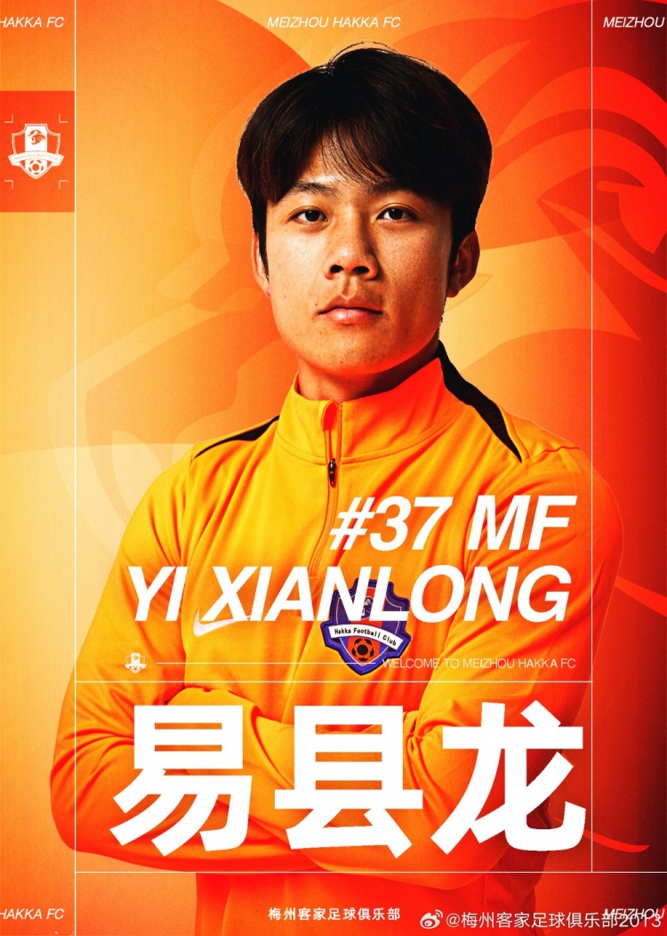 與球員本人友好協商一致,易縣龍已完成簽約手續,成功加盟梅州客家足球俱樂部,將隨隊征戰2025年中超聯賽及各項賽事。