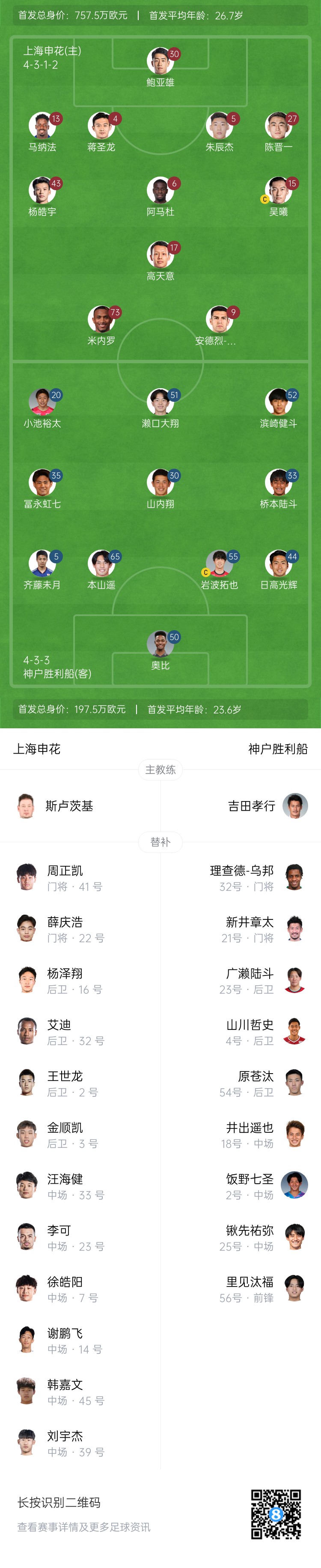 2月18日訊 北京時間今晚20點,亞冠精英聯賽東亞區第8輪,上海申花主場迎戰神戶勝利船,賽前兩隊公布首發陣容。