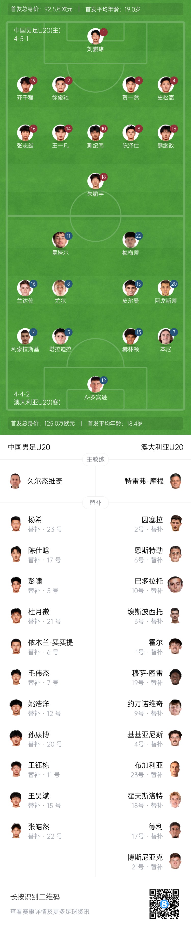 2月18日訊 北京時間19點30分,U20亞洲杯小組賽A組第三輪,中國vs澳大利亞,賽前雙方首發公布!本場比賽劉誠宇因累積黃牌停賽,較上場比賽國青首發更換6人,澳大利亞則更換了9人。