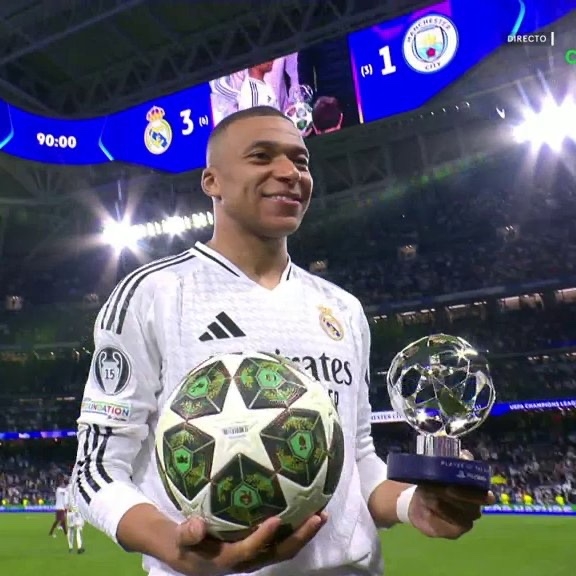 姆總霸氣外露!姆巴佩賽后手持全場最佳獎杯+戴帽足球合影