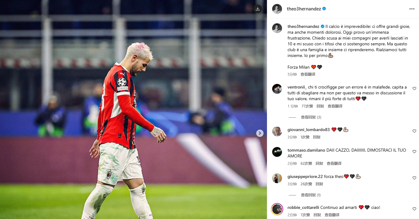 02月20日訊 歐冠附加賽次回合,特奧假摔染紅,米蘭遭費耶諾德淘汰。特奧發文致歉。特奧:“足球是不可預測的,它帶給我們巨大的快樂,也有痛苦時刻。今天我感到無比的沮喪。我向我的隊友們道歉,因為我讓他們只剩下10個人作戰。我也向一直支持我們的球迷們道歉。但這個俱樂部就像是一個大家庭,團結一致我們會恢復的。讓我們一起重新站起來,從我開始。????????” 本文標簽: 足球 意甲 AC米蘭 歐冠
