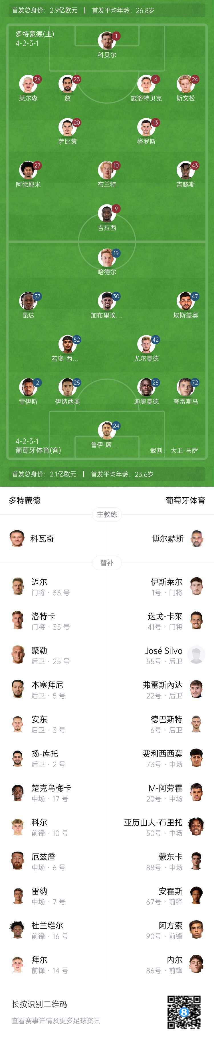 葡體替補:1-伊斯雷爾、41-卡萊、6-德巴斯特、20-馬克西米利亞諾-阿勞霍、22-弗雷斯內達、50-布里托、55-何塞-席爾瓦、67-安霍斯、73-費利西西莫、86-拉斐爾-內爾、88-門東薩、90-阿方索-莫雷拉