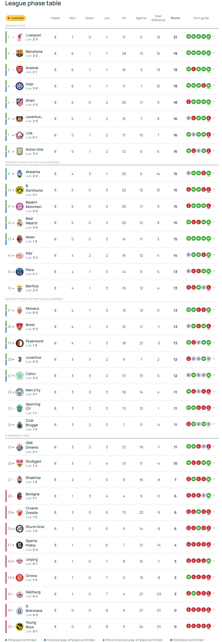 01月30日訊 歐冠聯(lián)賽階段末輪18場比賽同時開賽,實時積分情況如圖。 本文標簽: 足球 英超 曼城 阿森納 利物浦 西甲 皇家馬德里 巴塞羅那 馬德里競技 意甲 AC米蘭 國際米蘭 尤文圖斯 亞特蘭大 德甲 拜仁慕尼黑 多特蒙德 勒沃庫森 斯圖加特 法甲 巴黎圣日耳曼 摩納哥 布雷斯特 阿斯頓維拉 赫羅納 里爾 五洲 荷甲 葡超 蘇超
