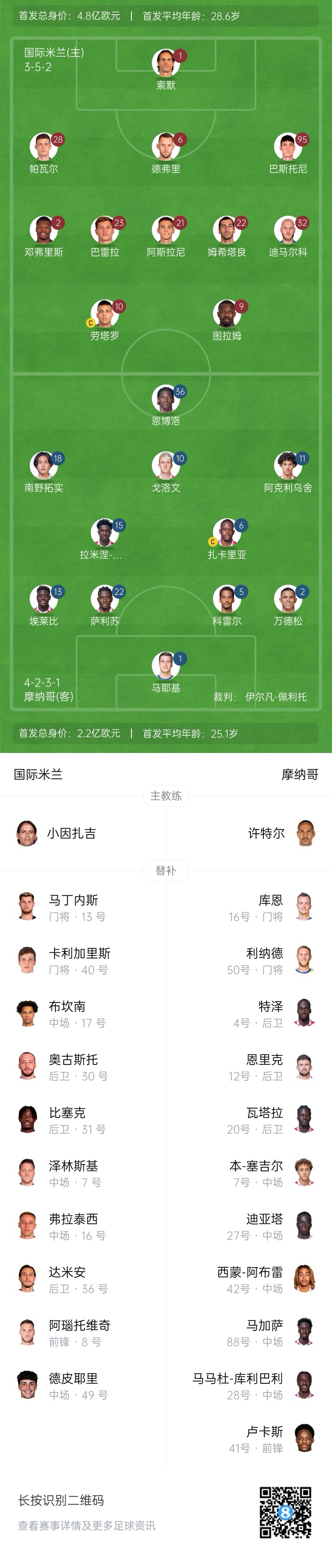 1月30日訊 北京時(shí)間1月30日星期四04:00,歐冠聯(lián)賽階段第8輪,國(guó)際米蘭坐鎮(zhèn)主場(chǎng)梅阿查迎戰(zhàn)摩納哥,目前雙方已經(jīng)公布了本場(chǎng)比賽的首發(fā)陣容。