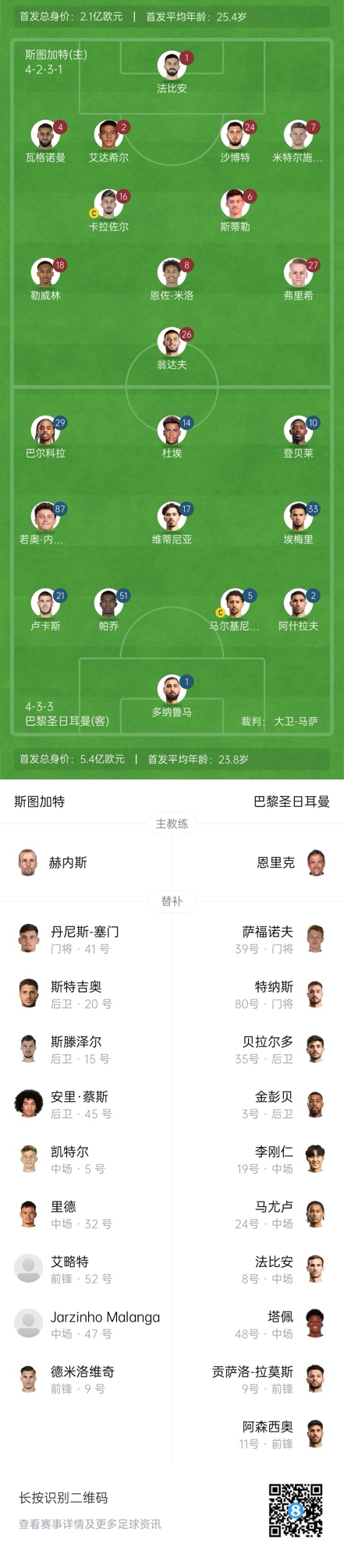 1月30日訊 歐冠聯賽階段第8輪,巴黎圣日耳曼將赴客場vs斯圖加特,賽前首發名單公布。