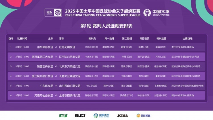 2025中國太平女超聯賽第1輪 裁判人員選派名單 ???