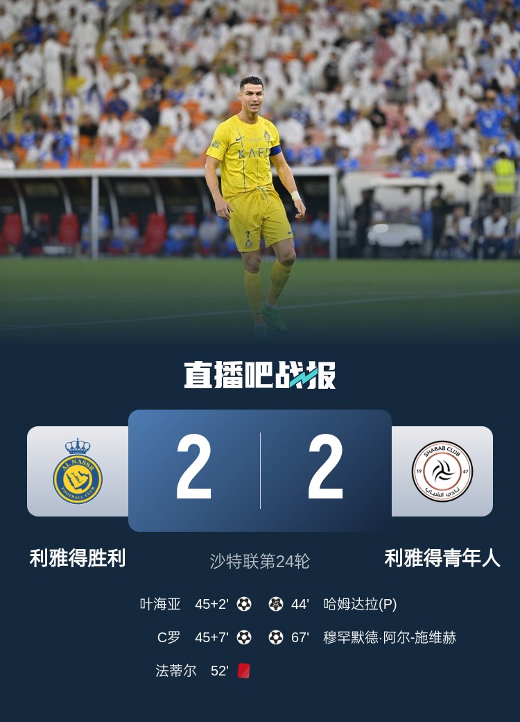 C羅破門,十人勝利主場2-2戰平青年人。勝利各賽事近6場僅1勝,距榜首吉達聯合10分。