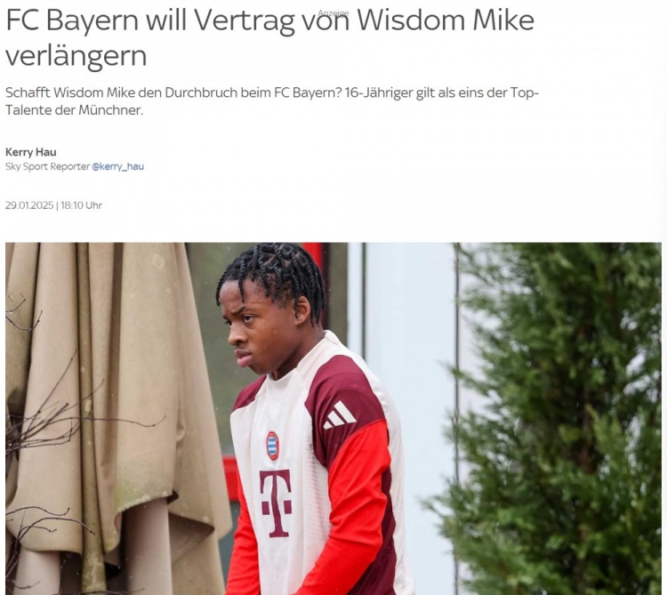 1月30日訊 德國天空體育消息,拜仁正和16歲天才邊鋒威斯多姆-麥克商談續(xù)約。