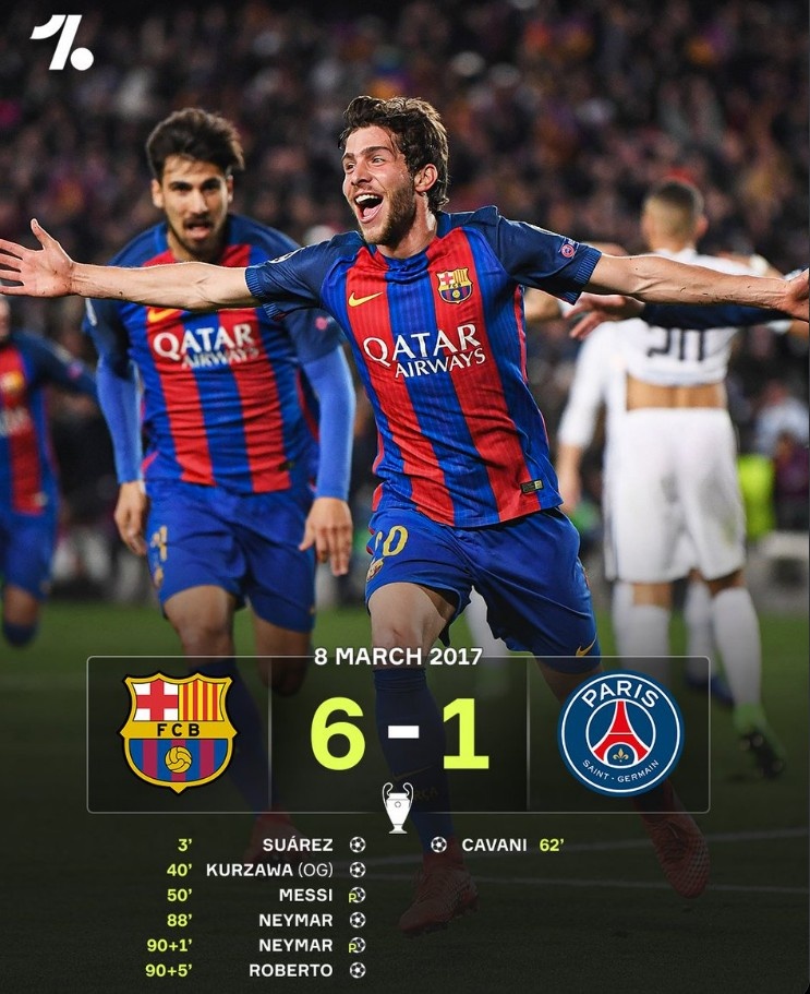 3月8日訊 在2017年的今天,巴薩在歐冠淘汰賽次回合以6-1大勝巴黎,成為歐冠歷史首支首回合0-4落后最終逆轉晉級的球隊。本場比賽蘇亞雷斯開場3分鐘破門拉起反擊號角,庫爾扎瓦打進烏龍球,下半場梅西破門,雖然卡瓦尼扳回一城,但是內馬爾梅開二度,羅貝托在補時第5分鐘打進反超總比分的一球。 本文標簽: 足球 西甲 巴塞羅那