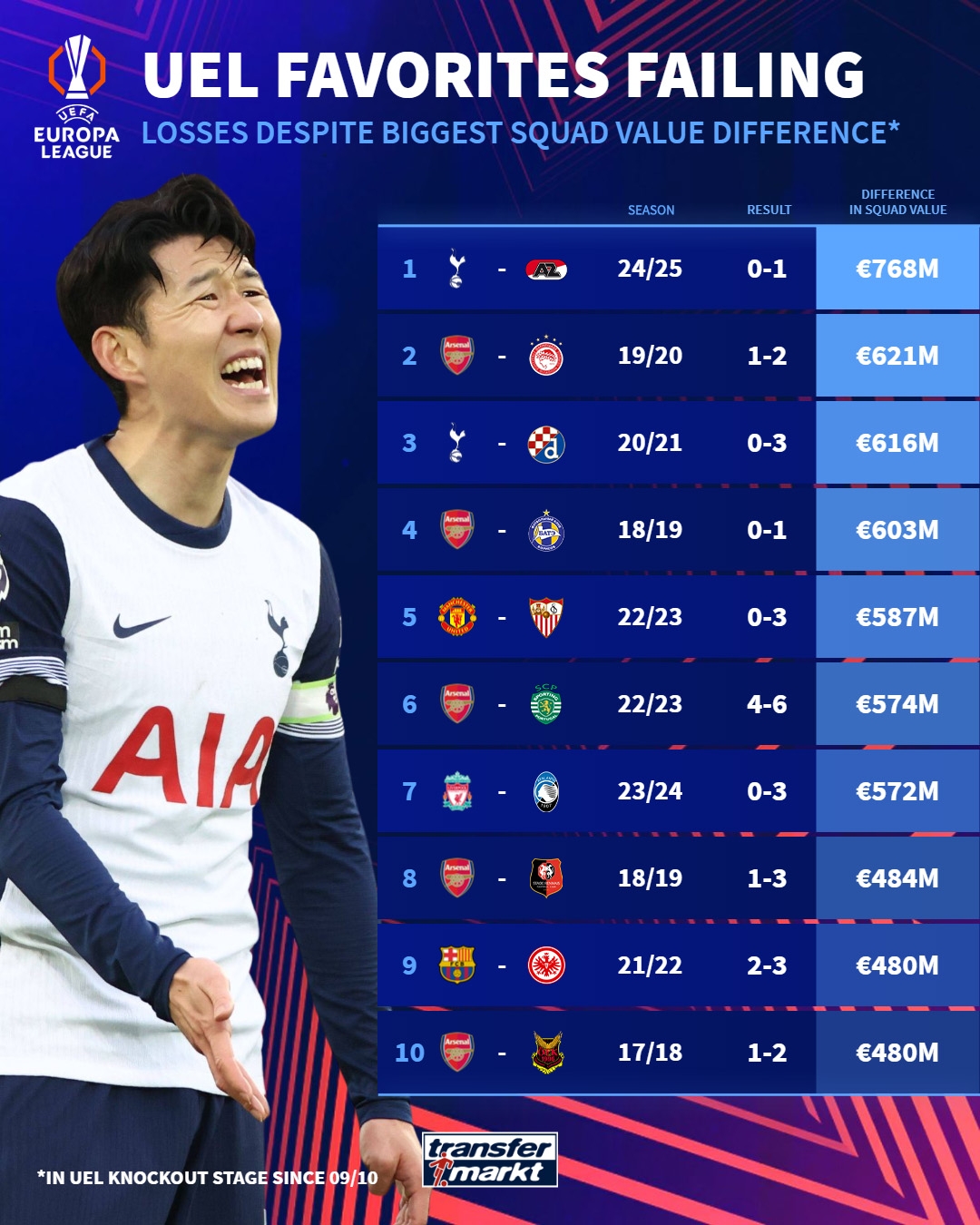 據德轉統計,兩隊陣容身價差達到7.68億歐,創造了一項尷尬紀錄——歐聯輸球的最大身價差。