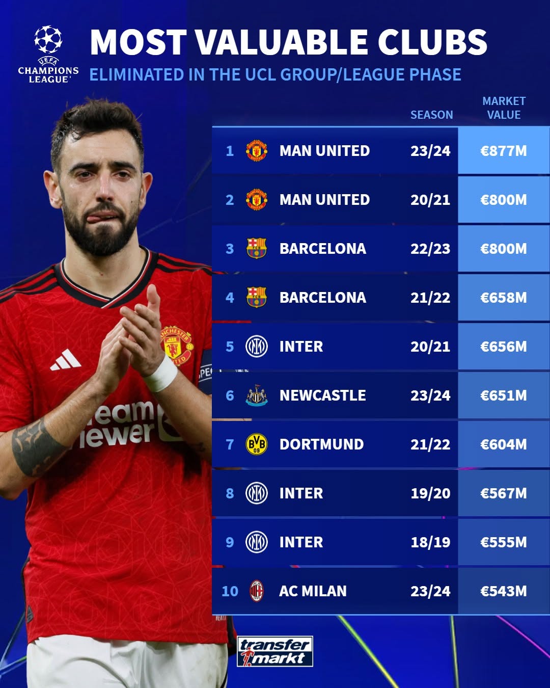 1月30日訊 德國轉會市場盤點了歷史上歐冠小組賽被淘汰的身價最昂貴球隊,曼城和巴黎今晚仍有出局風險,若他們出局,將刷新紀錄。