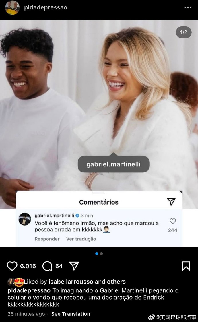 恩德里克在社媒曬自己與妻子Gabriely Miiranda的合影,但是卻把妻子標(biāo)注成了阿森納球員加布里埃爾-馬丁內(nèi)利。馬丁內(nèi)利回復(fù):“兄弟,你太厲害了!但我好像覺得你@ 錯人了????? 本文標(biāo)簽: 足球 西甲 皇家馬德里