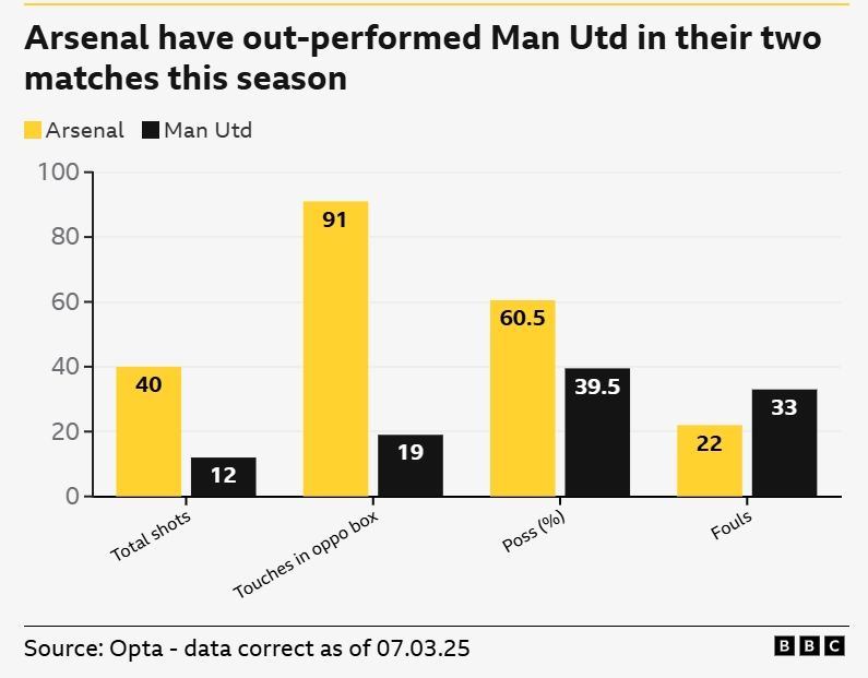 曼聯vs阿森納今夜再度上演,BBC賽前列出本賽季兩隊此前交手時的關鍵數據,槍手占據壓倒性優勢。射門數:40-12對手禁區觸球次數:91-19控球率:60.5%-39.5%犯規:22-33 本文標簽: 足球 英超 曼聯 阿森納