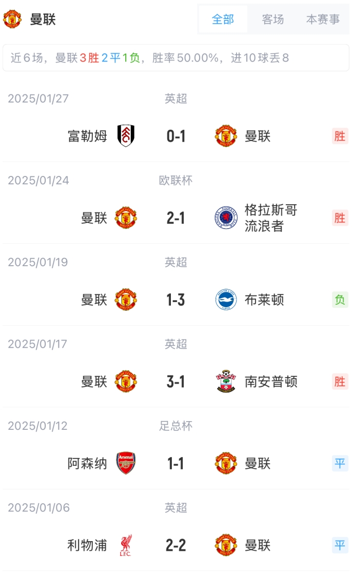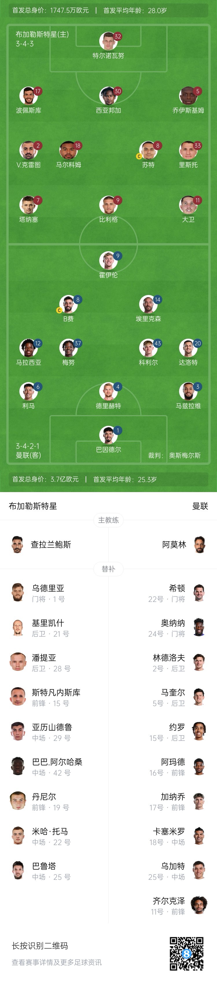 曼聯首發:1-巴因德爾、12-馬拉西亞、3-馬茲拉維、4-德里赫特、6-利桑德羅、20-達洛特、37-梅努、43-科利爾、14-埃里克森、8-B費、9-霍伊倫