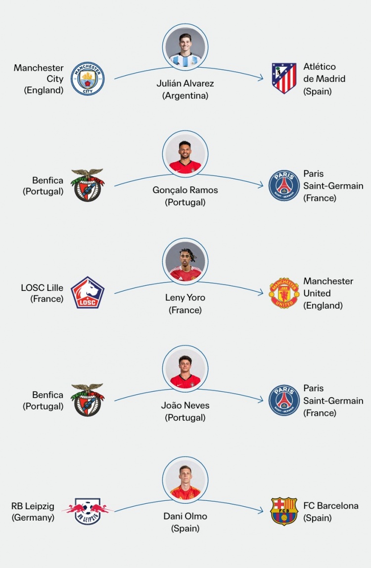 1月31日訊 國際足聯統計了2024年轉會費最高的5筆引援,其中,阿爾瓦雷斯成為年度標王。2024年球員轉會費排行榜↓(費用為德轉數據)1、阿爾瓦雷斯(曼城→馬競)——7500萬歐2、貢薩洛-拉莫斯(本菲卡→巴黎)——6500萬歐3、約羅(里爾→曼聯)——6200萬歐4、若奧-內維斯(本菲卡→巴黎)——5992萬歐5、奧爾莫(萊比錫→巴薩)——5500萬歐 本文標簽: 足球 英超 曼聯 西甲 巴塞羅那 馬德里競技 法甲 巴黎圣日耳曼