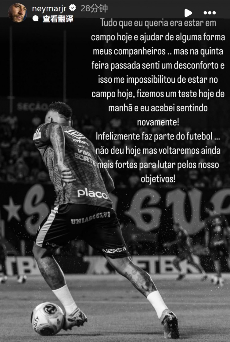 3月10日訊 今天,桑托斯在巴西錦標半決賽的比賽中1-2不敵科林蒂安,內馬爾在社媒發文說明了他未能登場的原因。內馬爾寫道:“我想要的是今天在球場上,以某種方式幫助我的隊友,但上周四我感到有些不舒服,這讓我無法上場,今天早上我們又做了檢查,而我自己感覺也不好!”“不幸的是,這是足球的一部分,但我會更堅強的回來,為我們的目標奮斗!” 本文標簽: 足球 五洲 巴甲