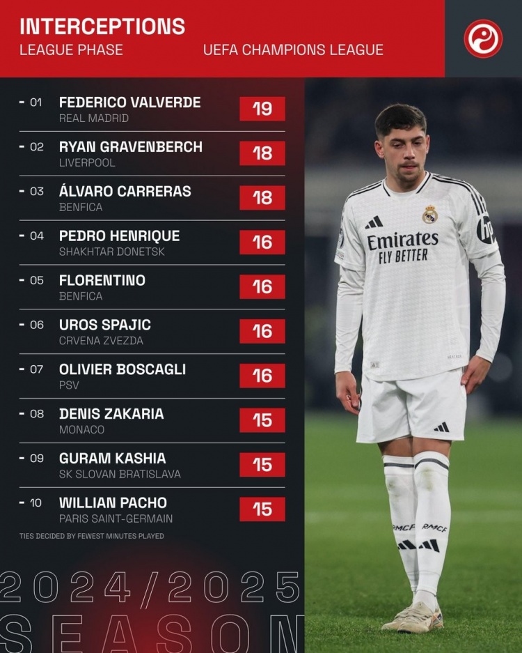 1月31日訊 本賽季歐冠小組賽已經完賽,squawka統計了本賽季歐冠攔截榜,巴爾韋德居首。