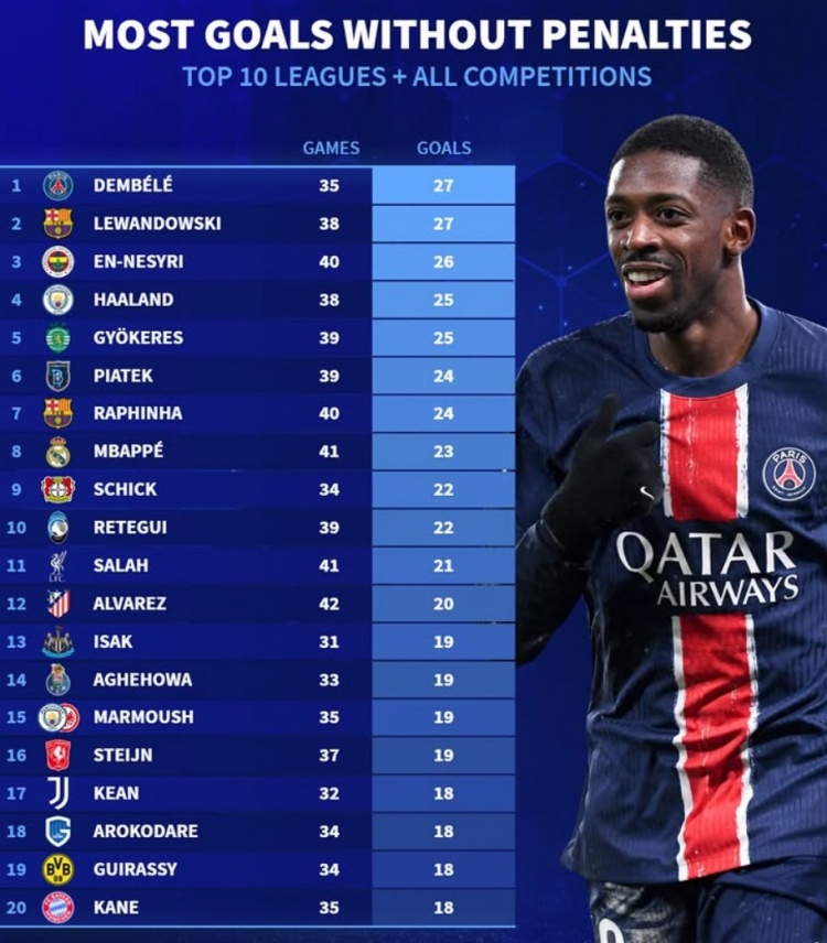 3月10日訊 《轉會市場》統計了本賽季歐足聯排名前十聯賽,并列出了各項賽事的不計入點球的射手榜情況,登貝萊和萊萬均打進27球。