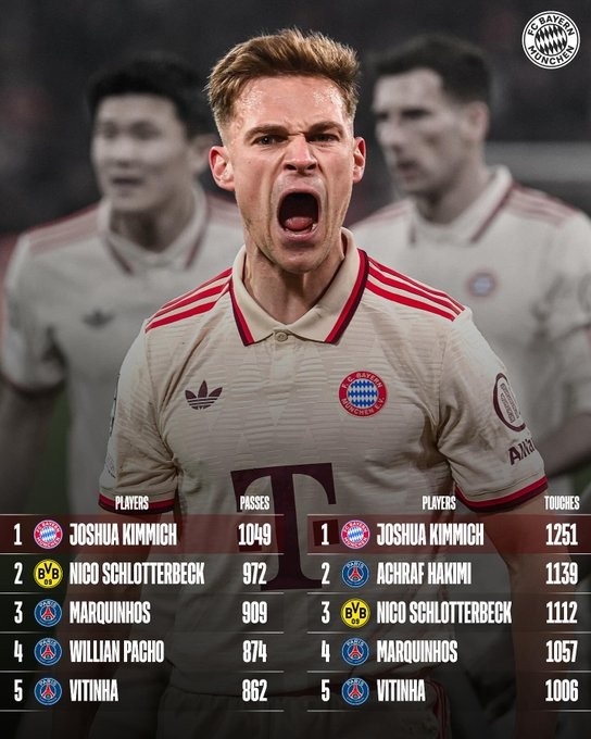 基米希領跑本賽季歐冠傳球與觸球統(tǒng)計榜