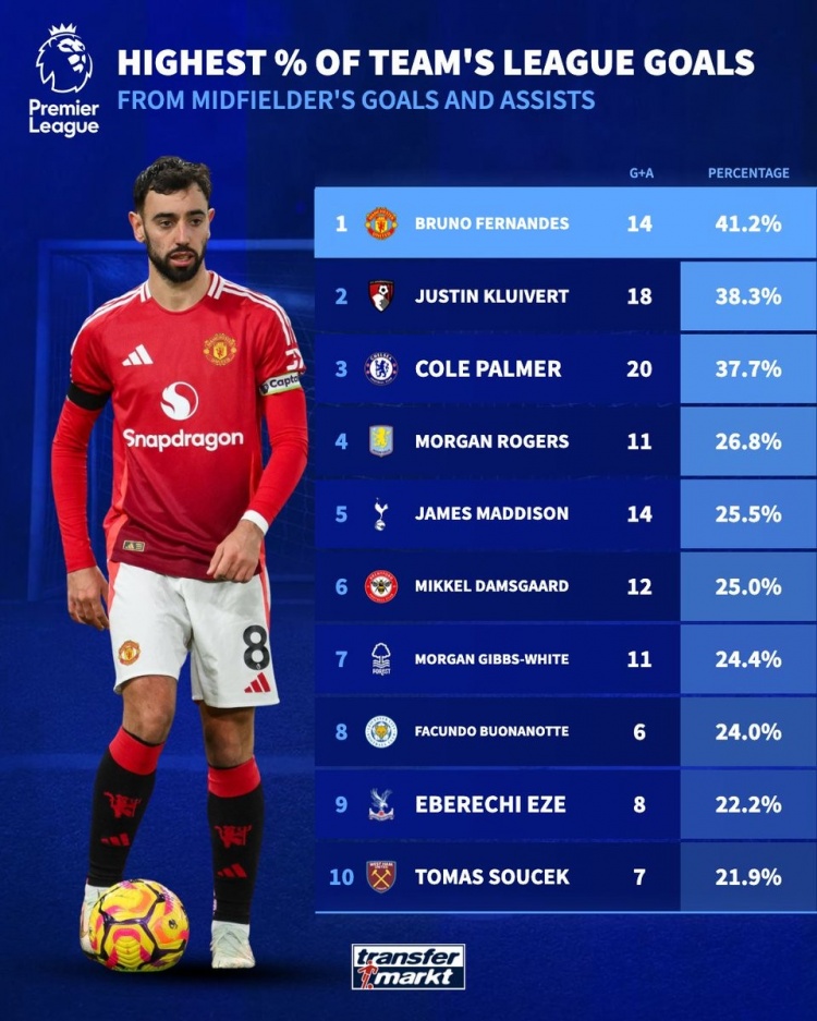3月10日訊 《轉(zhuǎn)會市場》統(tǒng)計了本賽季英超中場球員參與全隊聯(lián)賽總進球的比率,B費獨占榜首。