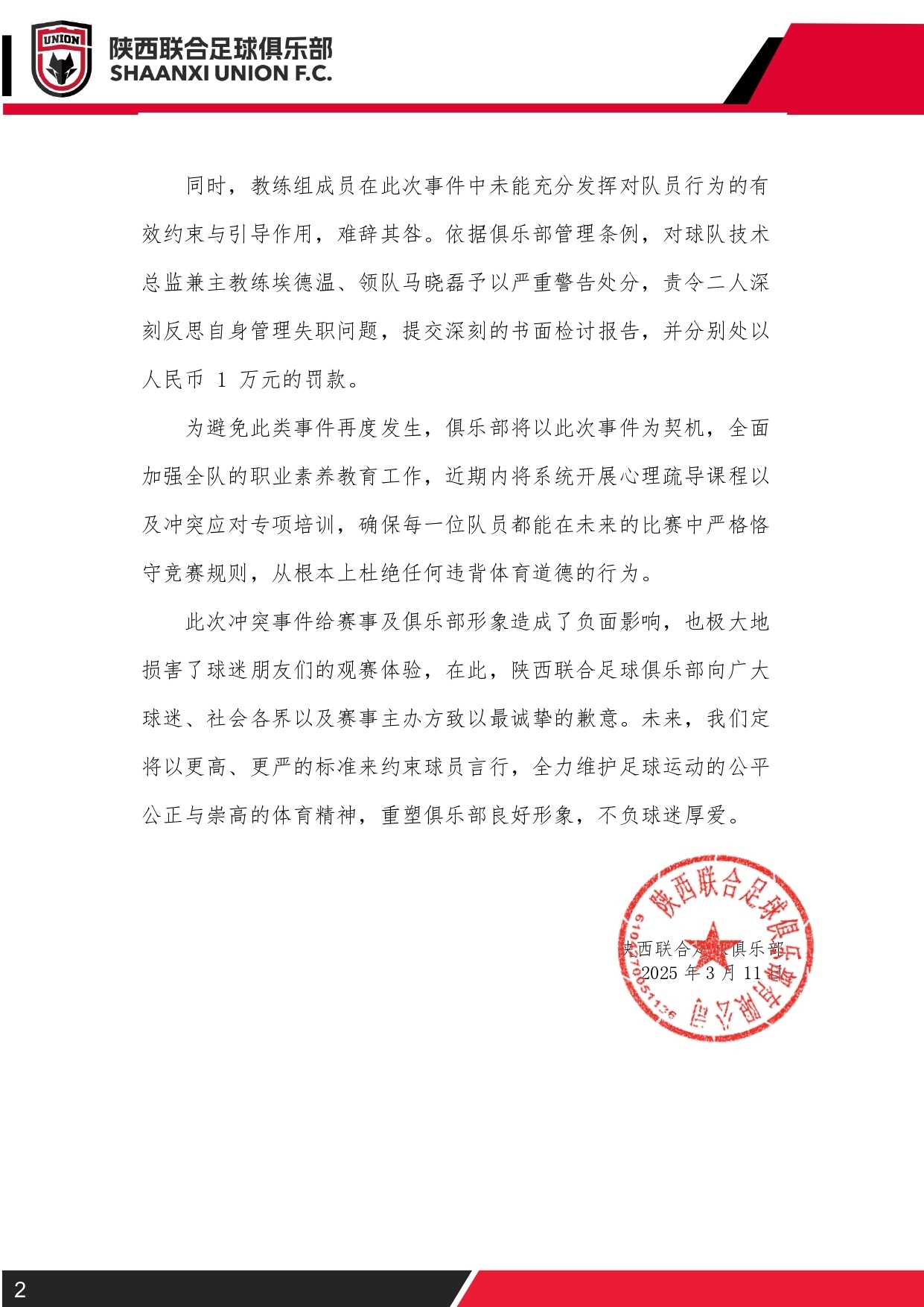 同時,教練組成員在此次事件中未能充分發揮對隊員行為的有效約束與引導作用,難辭其咎。依據俱樂部管理條例,對球隊技術總監兼主教練埃德溫、領隊馬曉磊予以嚴重警告處分,責令二人深刻反思自身管理失職問題,提交深刻的書面檢討報告,并分別處以人民幣1萬元的罰款。