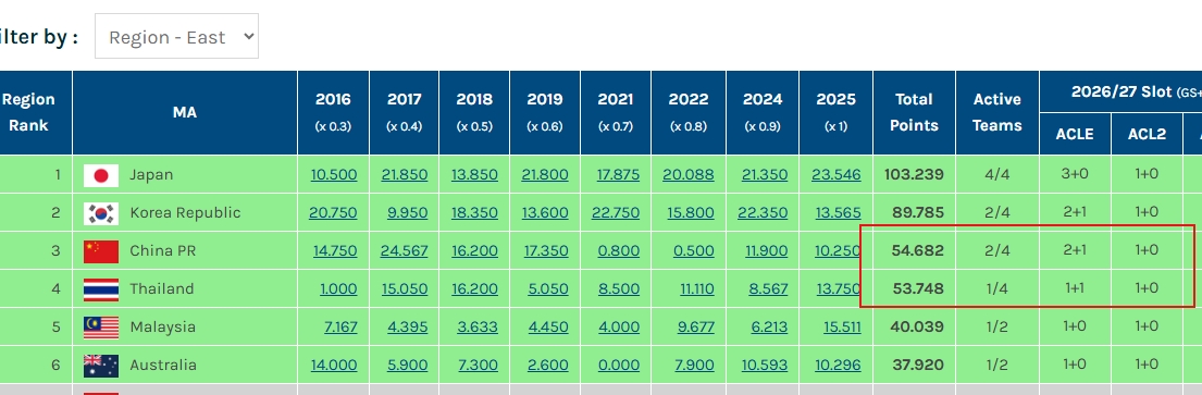 在泰山退賽情況下,目前中超球隊(duì)在亞冠賽場僅剩海港、申花兩隊(duì)爭取技術(shù)分。目前中國積分為54.682,身后泰國積53.748分虎視眈眈。一旦中國被泰國超越,那么26/27亞冠精英聯(lián)賽的名額將縮減為1+1。