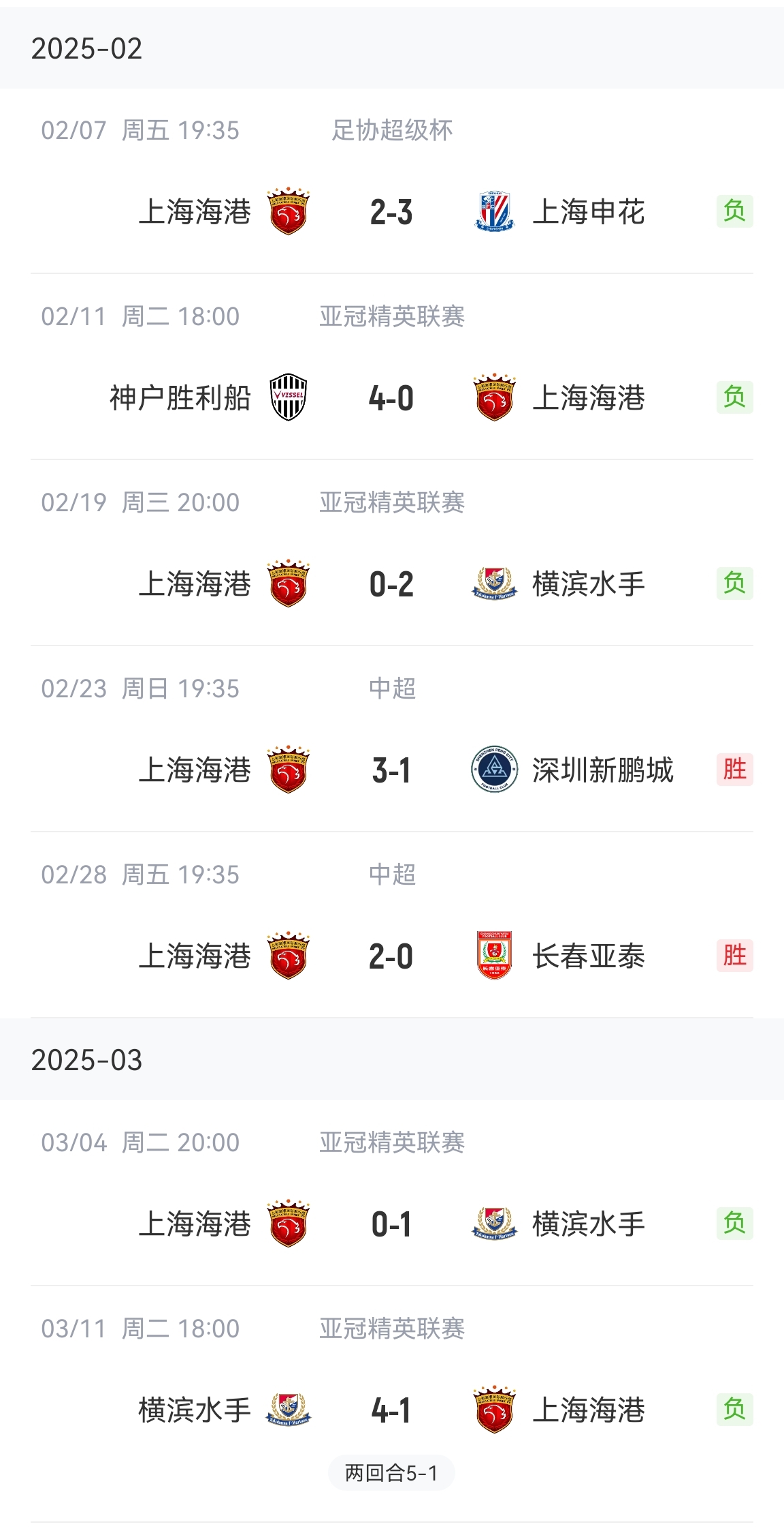 2025年海港超級(jí)杯2-3遭申花逆轉(zhuǎn),亞冠4場全敗,聯(lián)賽則取得了兩連勝。