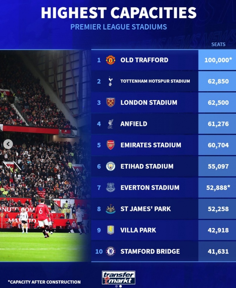 - 德轉列英超主場容量:曼聯新主場10萬人將獨一檔 軍槍刺錘均6萬人