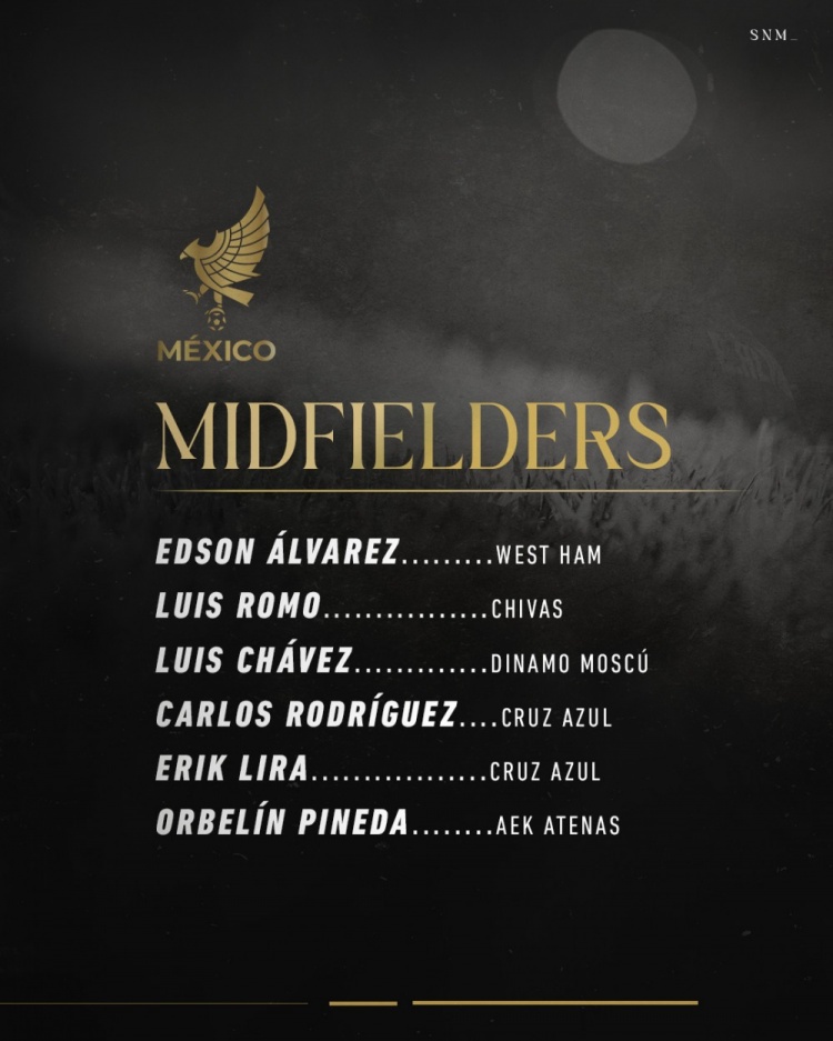 前鋒:圣地亞哥-希門(mén)尼斯(米蘭)、貝加(托盧卡)、勞爾-希門(mén)尼斯(富勒姆)、奎尼奧內(nèi)斯(卡迪西亞)、阿爾瓦拉多(瓜達(dá)拉哈拉)、韋爾塔(安德萊赫特)、埃弗林-阿爾瓦雷斯(蒂華納)