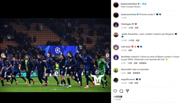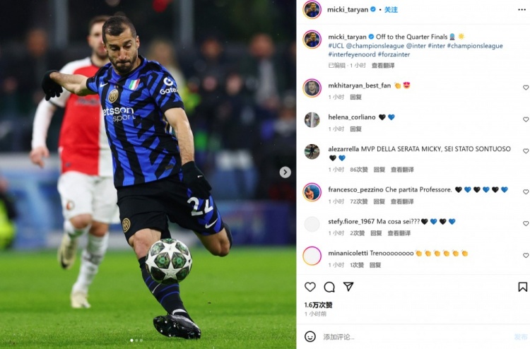 3月12日訊 國米在本輪歐冠主場2-1再次擊敗費耶諾德,他們將在歐冠八強戰和拜仁相遇。隊內多位大將也通過社媒曬照慶祝晉級。勞塔羅曬出全隊賽后奔向球迷的慶祝照,并配文:“晉級下一輪!”本場表現出色的姆希塔良曬出自己的比賽照,并表示:“晉級八強戰!”進球功臣小圖拉姆則曬出自己的滑跪慶祝照,并配文:“電影時刻!”第8分鐘,圖拉姆帶球突入禁區左側,隨后內切擺脫調整后起腳兜射破門。 本文標簽: 足球 意甲 國際米蘭 德甲 拜仁慕尼黑 歐冠 荷甲