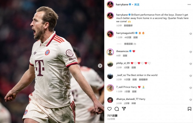 凱恩也在賽后通過社媒曬出自己的比賽照,并配文:“全隊交出精彩表現,沒有比這更棒的客場次回合了。八強戰我們來了!”