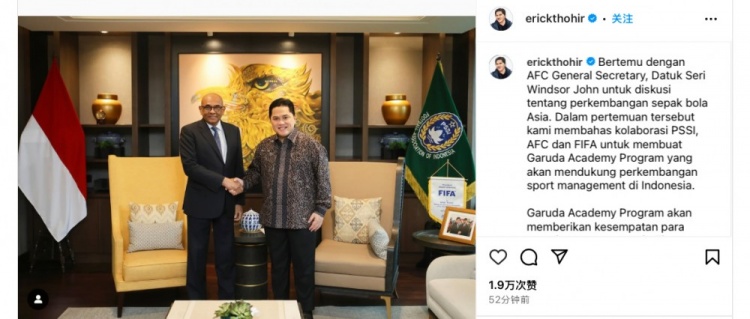 托希爾在社媒配文寫道:“今日會見了亞足聯秘書長拿督溫莎-約翰,會上我們共同就亞洲足球未來的發展方向進行探討,此外還討論了印尼足協與亞足聯、國際足聯合作開辦的雄鷹足球學院項目,以進一步促進印尼足球的發展。”