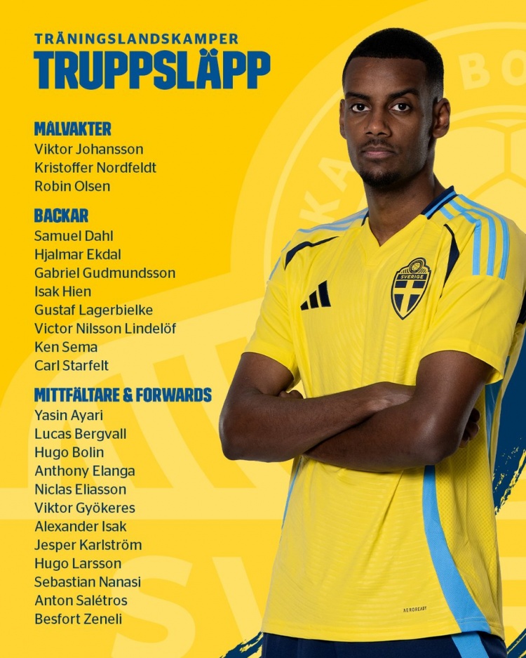 中前場:阿亞里(布萊頓)、貝里瓦爾(熱刺)、博林(馬爾默)、伊蘭加(諾丁漢森林)、埃利亞松(雅典AEK)、約克雷斯(葡萄牙體育)、伊薩克(紐卡)、卡爾斯特羅姆(烏迪內(nèi)斯)、雨果-拉爾森(法蘭克福)、納納西(斯特拉斯堡)、薩萊特羅斯(AIK索爾納)、澤內(nèi)利(埃爾夫斯堡)