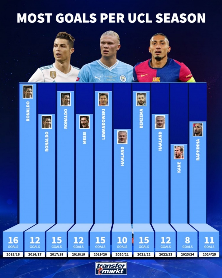 3月12日訊 本賽季拉菲尼亞狀態(tài)出色,目前在歐冠賽場(chǎng)以11粒進(jìn)球領(lǐng)跑射手榜。德轉(zhuǎn)也盤(pán)點(diǎn)了近10年歐冠單賽季最多進(jìn)球紀(jì)錄,具體如下: