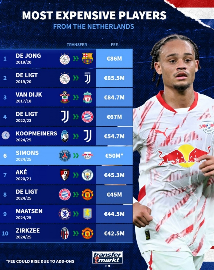 1月31日訊 哈維-西蒙斯正式從巴黎轉會萊比錫,固定轉會費5000萬歐,另外還有3000萬歐浮動獎金。德轉盤點了荷蘭球員歷史轉會費榜,具體如下(只統計固定轉會費):