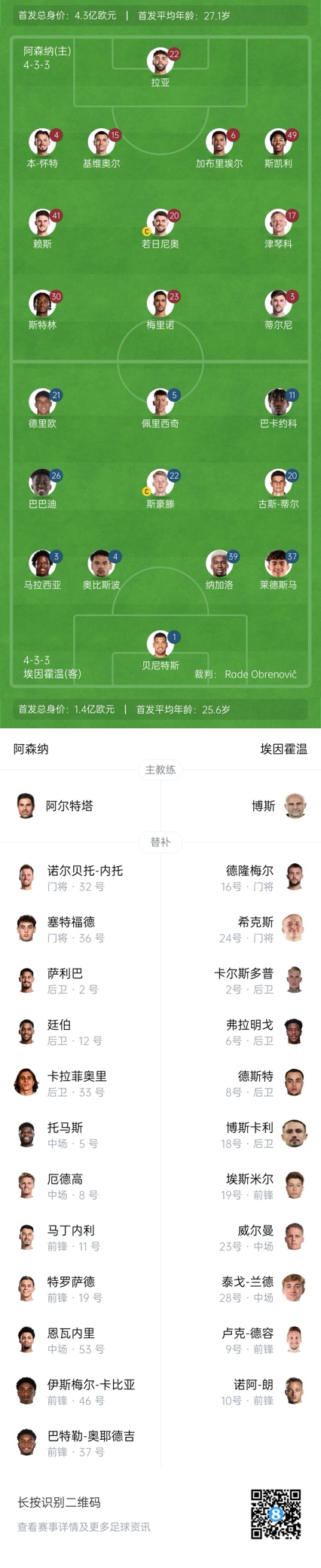 阿森納首發:22-拉亞、4-本-懷特、15-基維奧爾、6-加布里埃爾、49-斯凱利、41-賴斯、20-若日尼奧、17-津琴科、30-斯特林、23-梅里諾、3-蒂爾尼