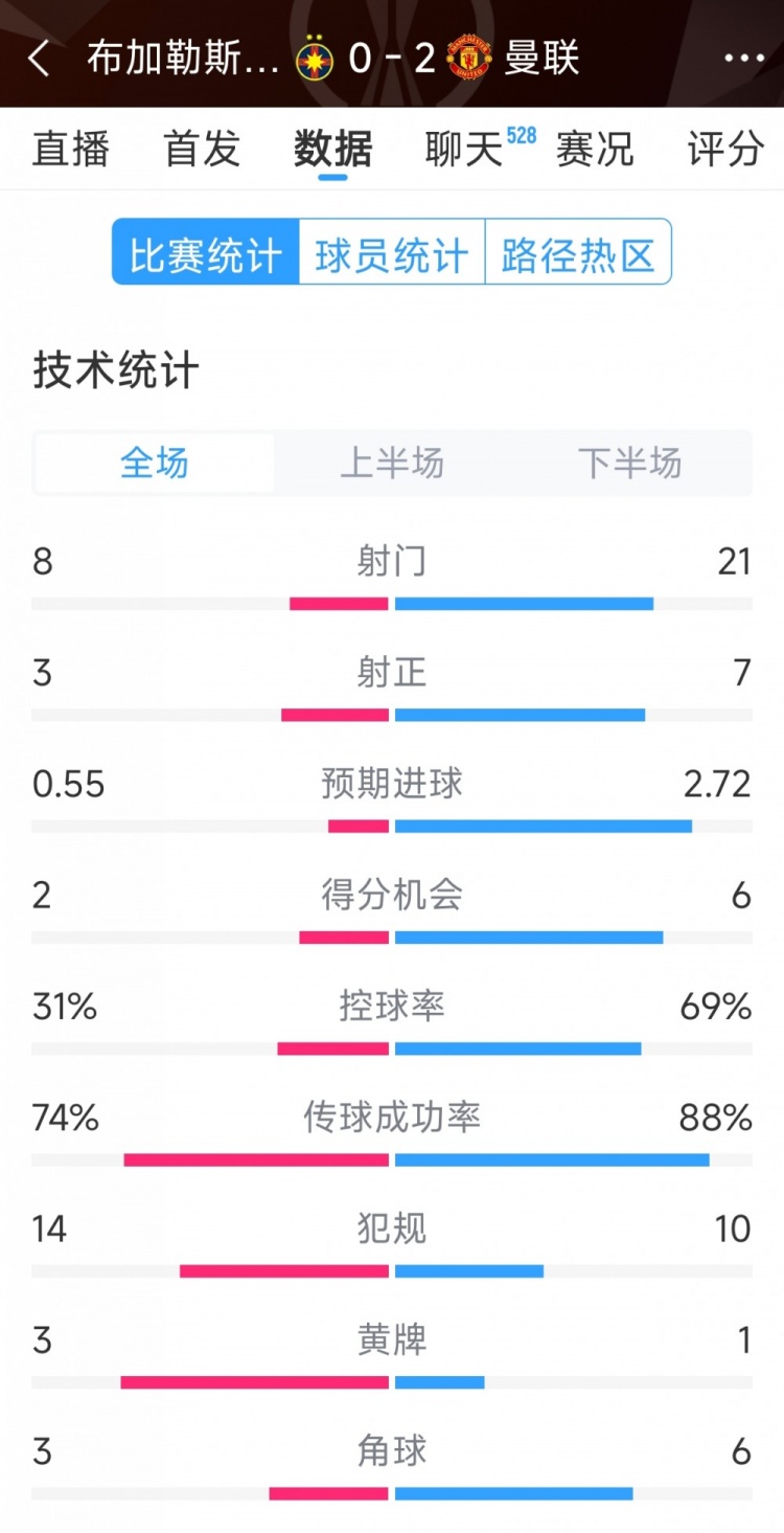 1月31日訊 在本輪歐聯杯,曼聯2-0擊敗布加勒斯特星,以下為雙方全場數據對比:布加勒斯特星vs曼聯射門:8-21射正:3-7預期進球:0.55-2.72得分機會:2-6控球率:31%-69%傳球成功率:74%-88%犯規:14-10黃牌:3-1角球:3-6 本文標簽: 足球 英超 曼聯