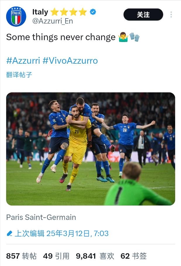 賽后,意大利國家隊官推曬出了2020歐洲杯決賽多納魯馬撲出決勝點球的瞬間,并寫道:“有些事情永遠都不會改變”。當時意大利隊與東道主英格蘭隊在決賽戰至點球大戰,三獅軍團第4、5順位出場的桑喬和薩卡的點球都被多納魯馬擋出,英格蘭隊無緣隊史首座歐洲杯冠軍。繼那屆歐洲杯之后,多納魯馬再次給英格蘭足球送上一記“重擊”。