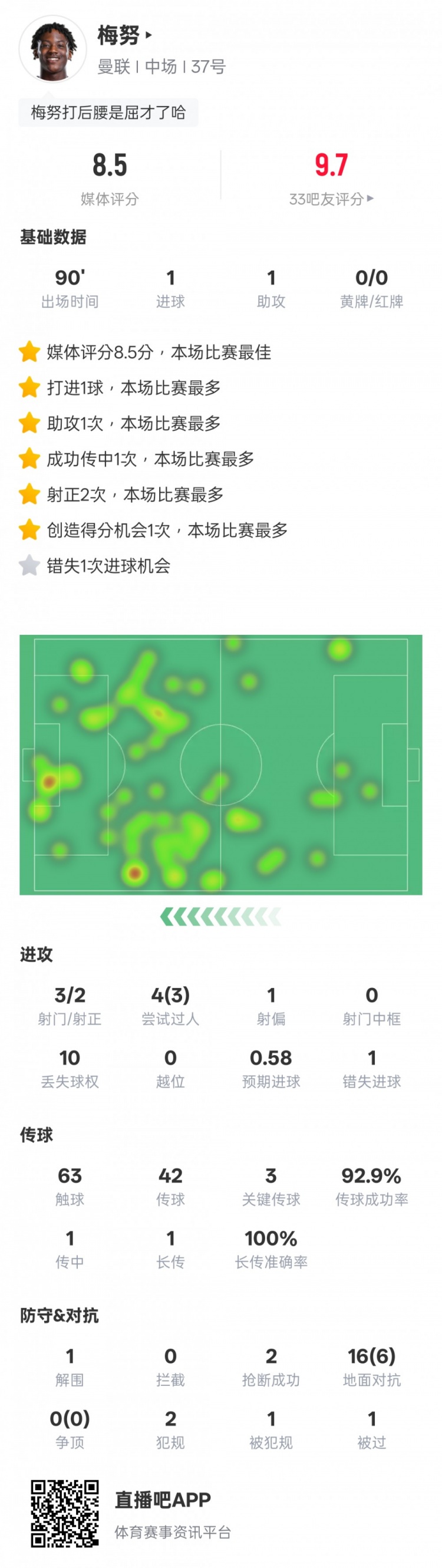 1月31日訊 歐聯杯聯賽階段第8輪,曼聯2-0戰勝布加勒斯特星,直通16強。本場比賽梅努首發出戰,傳射建功,還有3次關鍵傳球,3次過人成功,評分8.5全場最高。梅努本場比賽數據如下:進球1助攻1射門3射正2過人4過人成功3射偏1丟失球權10錯失進球機會1觸球63傳球42關鍵傳球3傳球成功率92.9%傳中1長傳1長傳準確率100%解圍1搶斷2地面對抗16地面對抗成功6犯規2被犯規1被過1 本文標簽: 足球 英超 曼聯