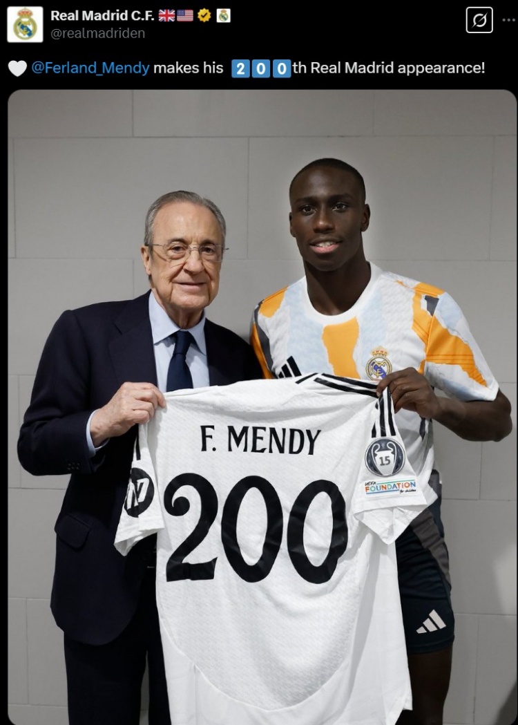 本場比賽也是門迪代表皇馬各項賽事第200次出場,球隊官方也曬出門迪與主席弗洛倫蒂諾的合照,祝賀他達成這一里程碑。