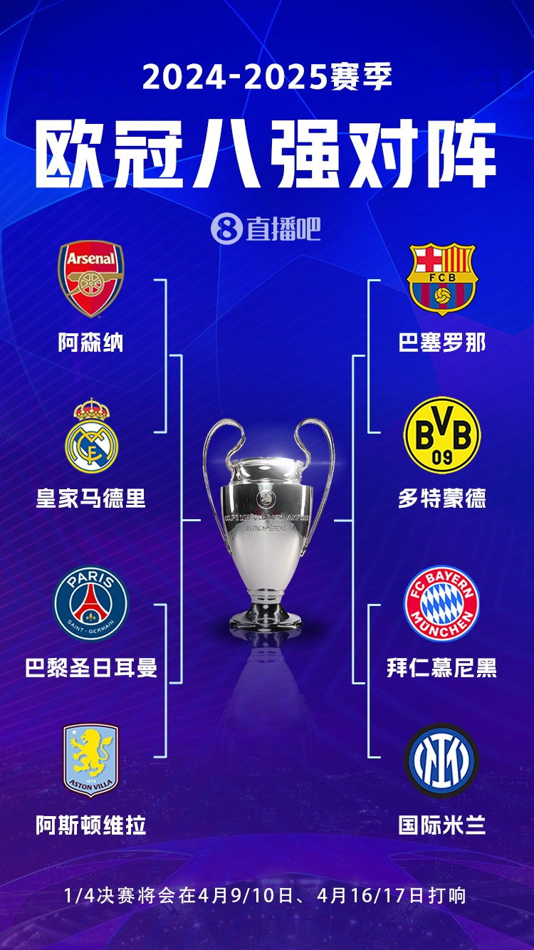 3月13日訊 歐冠16強戰已全部結束,歐足聯官網也公布了歐冠1/4決賽賽程,以下開球時間皆為北京時間。首回合4月9日周三凌晨3點阿森納vs皇馬拜仁vs國米4月10日周四凌晨3點巴黎vs維拉巴薩vs多特次回合4月16日周三凌晨3點多特vs巴薩維拉vs巴黎4月17日周四凌晨3點國米vs拜仁皇馬vs阿森納 本文標簽: 足球 英超 阿森納 西甲 皇家馬德里 巴塞羅那 意甲 國際米蘭 德甲 拜仁慕尼黑 多特蒙德 法甲 巴黎圣日耳曼 阿斯頓維拉 歐冠