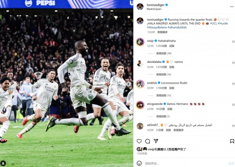 3月13日訊 在本輪歐冠,皇馬點球大戰擊敗馬競晉級。本場比賽呂迪格打進致勝點球,賽后他也在個人社媒曬出全隊瘋狂慶祝照,配文寫道:“沖向歐冠8強,Hala Madrid,永遠堅持到最后一刻!” 本文標簽: 足球 西甲 皇家馬德里