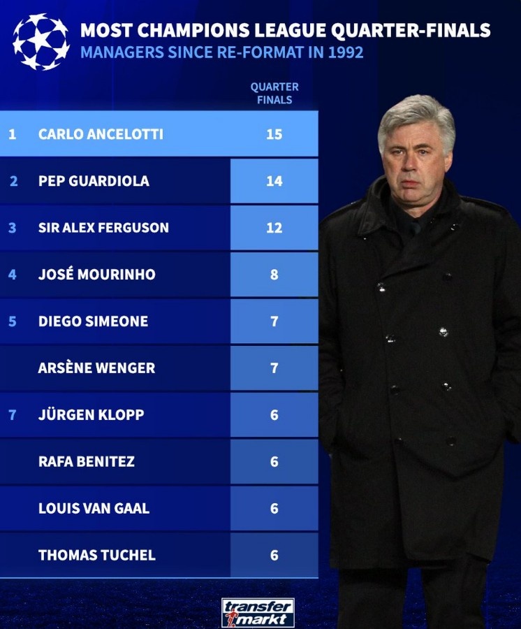 3月13日訊 在本輪歐冠,皇馬點球大戰(zhàn)擊敗馬競晉級。德轉(zhuǎn)也盤點了歐冠改制后主帥率領(lǐng)球隊晉級8強的次數(shù)榜,其中安切洛蒂居首。具體如下:1、安切洛蒂 15次2、瓜迪奧拉 14次3、弗格森 12次4、穆里尼奧 8次5、西蒙尼、溫格 7次7、克洛普、貝尼特斯、范加爾、圖赫爾 6次 本文標(biāo)簽: 足球 英超 皇家馬德里 西甲 曼城
