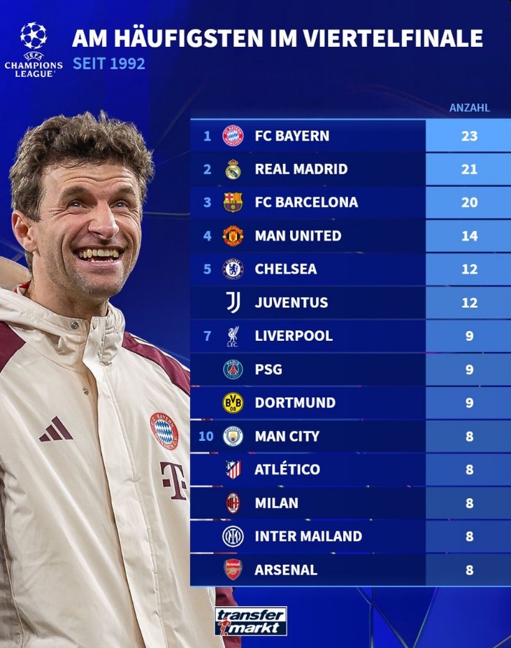 3月13日訊 本賽季歐冠8強產(chǎn)生,傳統(tǒng)豪門皇馬、巴薩、拜仁均在列,三支球隊也是歐冠改制后晉級8強次數(shù)最多的球隊,以下為具體次數(shù)榜: