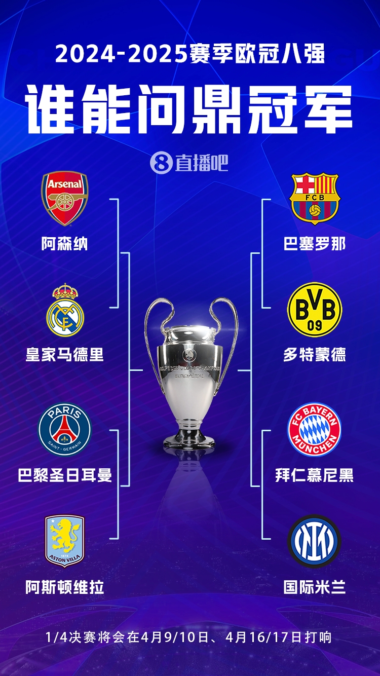 03月13日訊 歐冠8強今天凌晨全部出爐,上半?yún)^(qū)的4強分別是阿森納、皇馬、巴黎和維拉,下半?yún)^(qū)則是巴薩、多特、拜仁和國米。